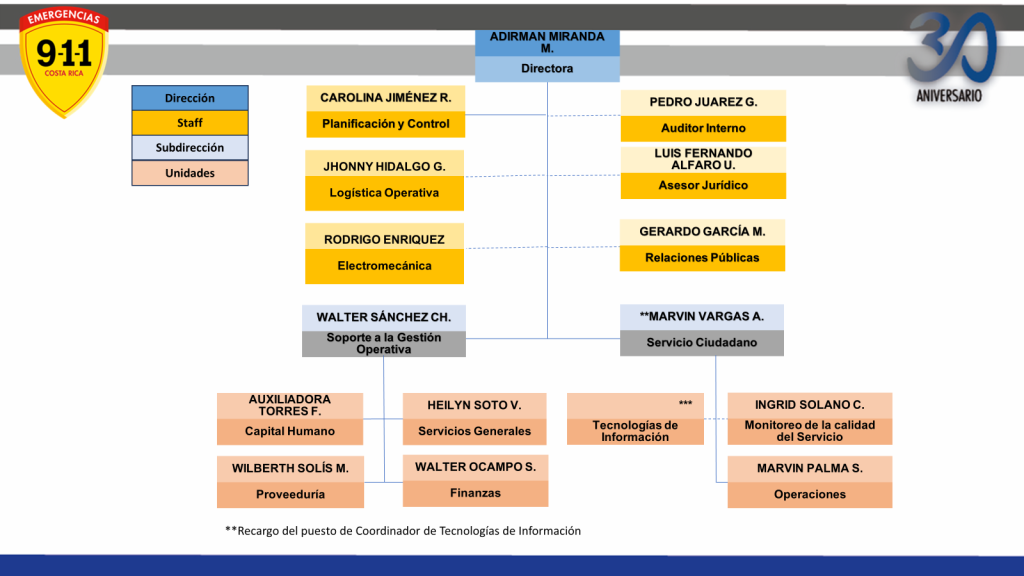 Bajo la tutela de la Dirección, son los encargados de dar suporte y asesoría a la Dirección y a los Procesos Instituciones del Sistema de Emergencias 9-1-1 en sus respectivas áreas.Licenciado en Administración de Negocios, con amplia experiencia en la conformación de equipos de equipos trabajo, gestión por proyectos, contratación administrativa, control interno y sistemas de gestión de calidad (INTE/ISO 9001-14001 y INTE/OHSA 18001). Cuenta con experiencia tanto en el sector privado cómo público, además desde el año 2008 laboró para el Grupo ICE, desempeñando puestos de jefatura y coordinación en diferentes proyectos hidroeléctricos. Desde el 2018 labora como Coordinador de Soporte a la Gestión Operativa, del Sistema de Emergencias 9-1-1.